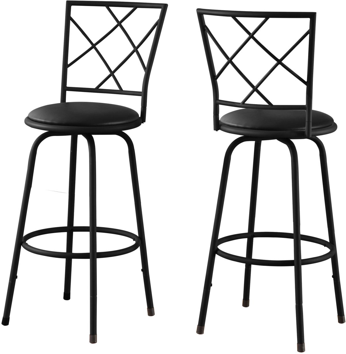 Perfect for your kitchen, breakfast bar or game room, this set of 2 bar stools will be a stylish addition to your home. With comfortably padded black leather-look seats, matte black metal frame, criss-cross back and perfectly positioned foot rest, these stools are as comfortable as they are visually appealing. The full swivel mechanism makes this contemporary style bar stool set a must have for your casual space! Assembly is required.