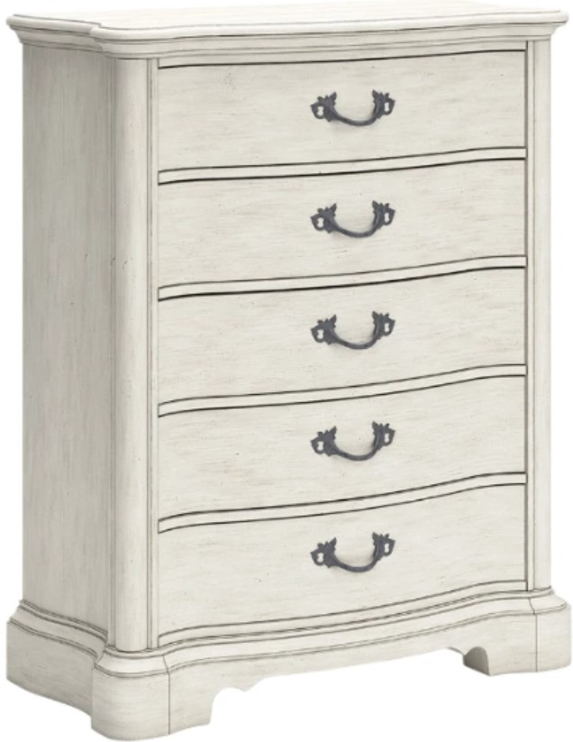 Add a touch of romance to your bedroom with this chest of drawers. Its antiqued white painted finish and serpentine-shaped silhouette details are the picture of easy elegance. Five spacious drawers offer ample storage space, while custom-designed bar pulls add originality.Read More