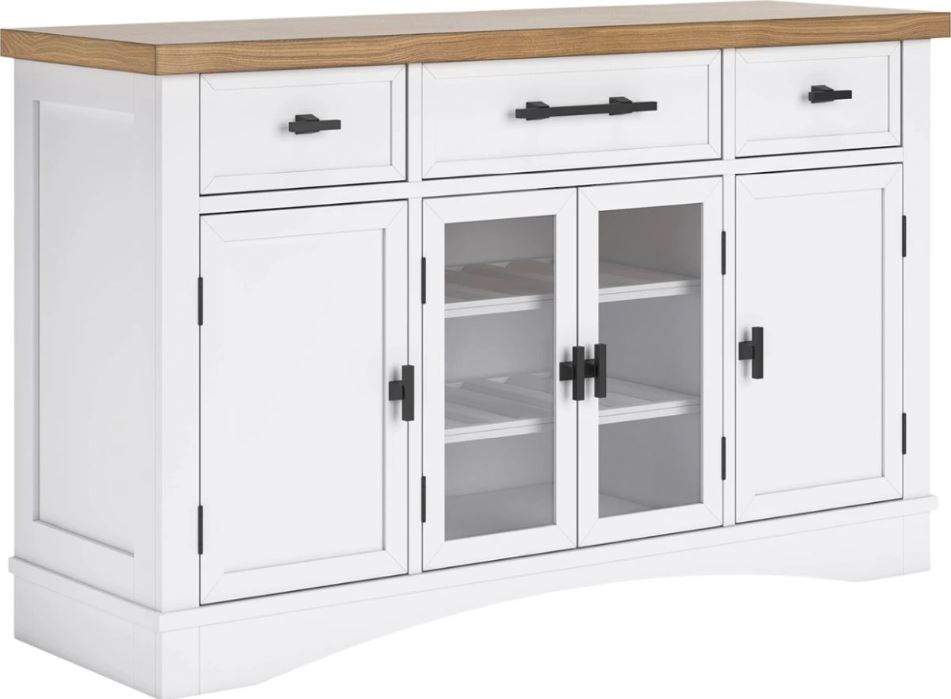 Casual style with substance. This dining server's two-tone finish of classic white and butcher block oak veneer adds a relaxed vibe to a delicious design. Spacious cabinets and drawers provide out-of-sight storage, while black bar pulls exude modern farmhouse vibes. This charmingly curated piece is a show of great taste.Read More