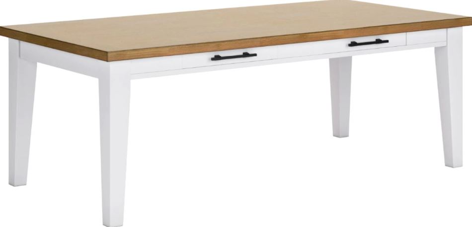 Casual style with substance. This dining table's two-tone finish of classic white and butcher block oak veneer adds a relaxed vibe to a delicious design. Convenient side drawers maximize space, while black bar pulls exude modern farmhouse vibes.Read More