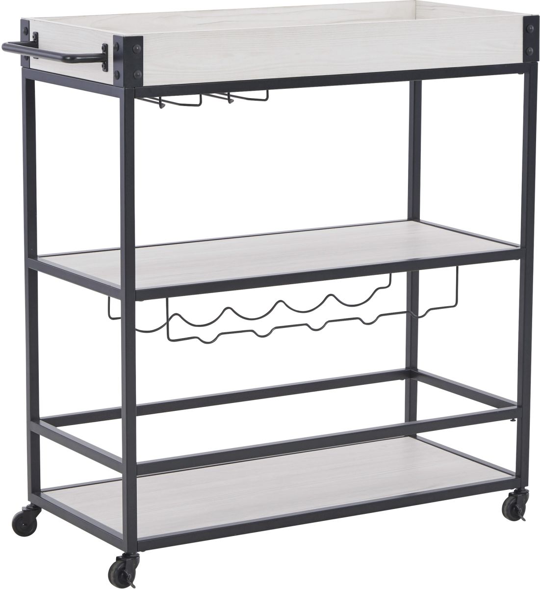 A whitewash finish keeps the top tray shelf and two lower shelves looking crisp. A stemware rack holds wine glasses with ease, while a slim rack on the bottom shelf holds wine bottles for sleek storage. Smooth-gliding casters provide easy mobility.Read More