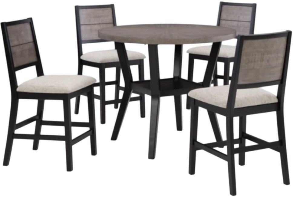 Refresh your dining area with this five-piece counter height table set. The table's two-tone finish pairs a distressed weathered gray wood tone with a matte black frame. The bar stools have stylish bent plank backs and comfy upholstered seats for an on-trend look you’ll love.Read More