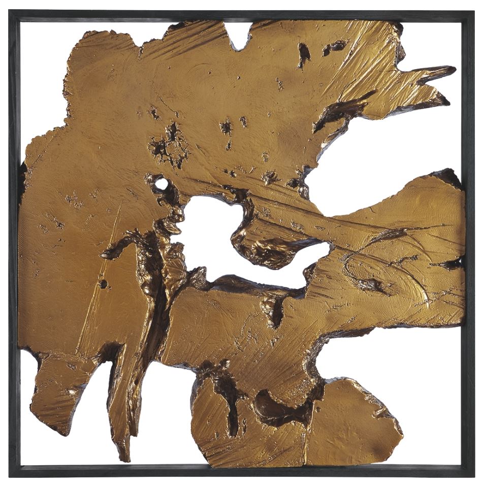 Create a fascinating focal point in any room using this square framed wall sculpture. Bring depth to any wall with its large three dimensional tree cross-section design. The cross-section is embellished in gold finished magnesium oxide that contrasts beautifully with the black frame. With all these unique elements, this sculpture easily complements a modern decor.Read More