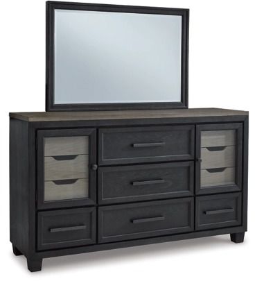 This dresser and mirror set is casual contemporary style simply done right. Its two-tone color scheme features a rich brushed black main color accented with a beautiful dusty grayish brown wood tone.Read More