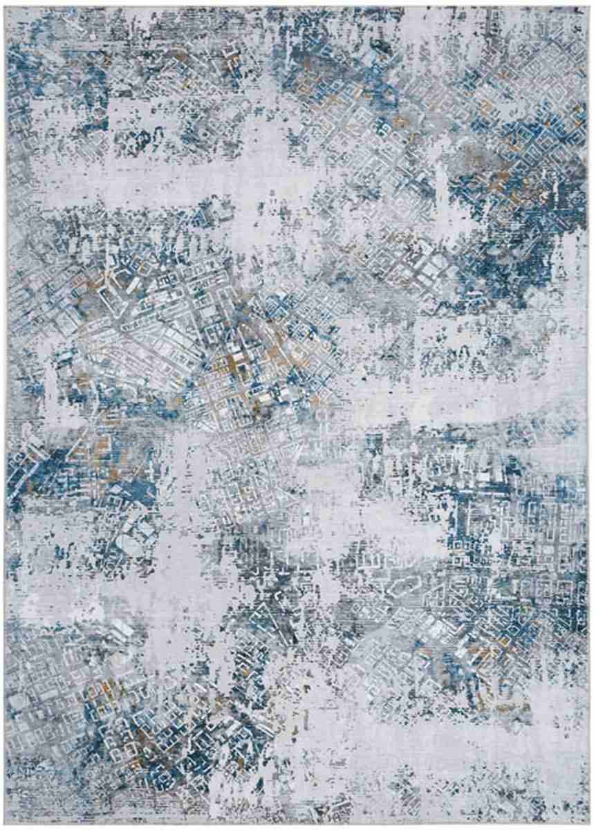 The Garyard Rug features printed abstract design in white, honey, and shades of blue and gray, polyester material, back with TPR, polyester, and cotton.Read More