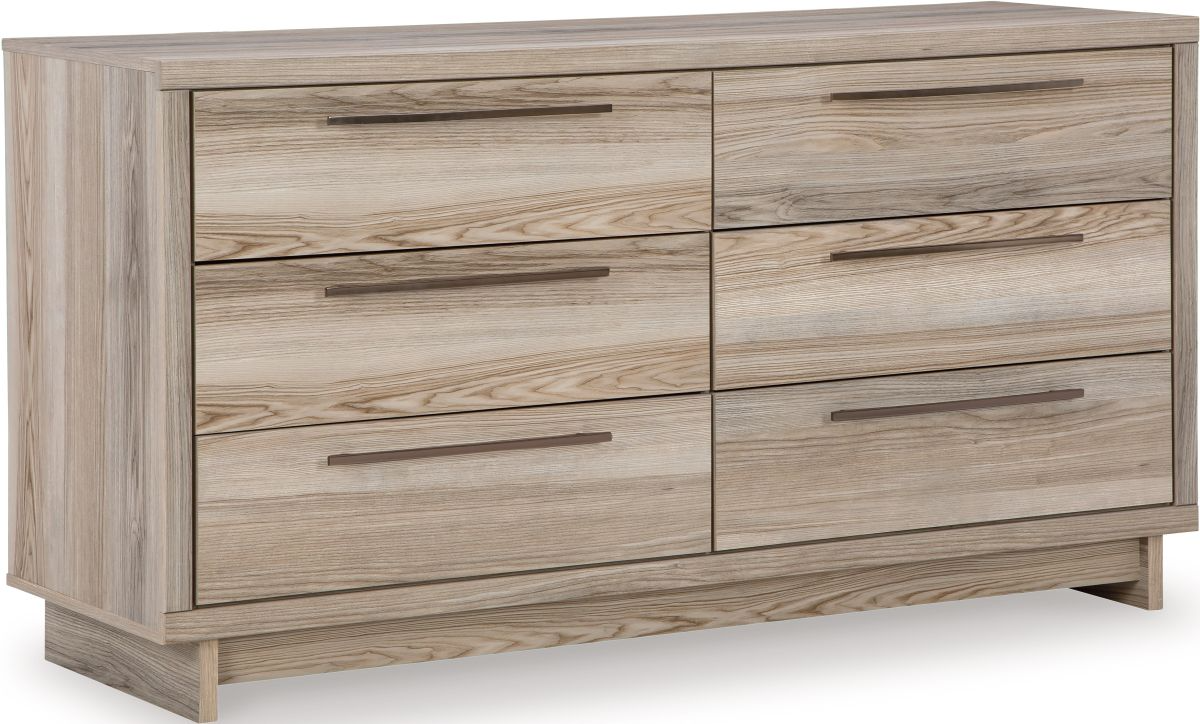 Modern meets neutral and sophisticated in this dresser. Its natural finish, subtle replicated wood grain and clean lines wake up your bedroom with eye-catching appeal. The generous storage space in its smooth-gliding, lined drawers brings function to relaxed refinement.Read More