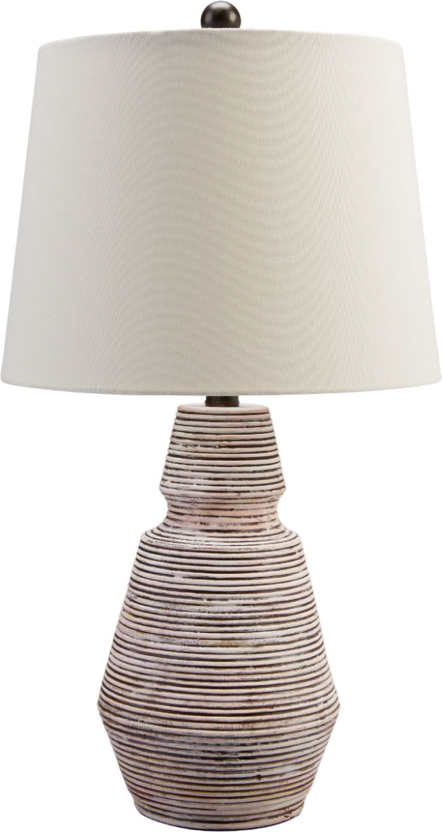 Add an impressive design element to your home with this table lamp. The distressed resin body in brick red and white is topped off with a crisp, fresh fabric shade. Low profile yet eye-catching, this lamp makes a gorgeous accent for contemporary and mid-century modern spaces.Read More