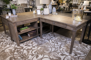 The Janismore desk is a stylish modular companion piece to this collection that can be configured as needed with all the other pieces or as a standalone writing desk. Casual traditional design. Made with Acacia solids, Elm veneer and engineered wood substrate. A distressed weathered gray finish with a casual wire brushed texture.Read More