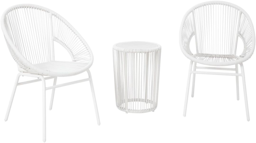 Treat yourself to trend-right outdoor design with this table and chair set. It elevates your patio, deck or poolside seating area with sleek white resin wicker over a durable powder coated steel frame. The included end table with an aluminum top keeps your essentials for everyday relaxation within reach.Read More