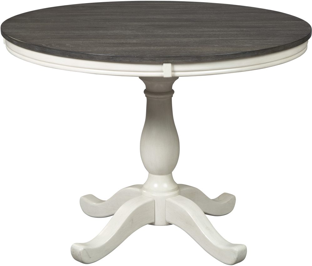 Timeless traditional design with a casual vibe. Small round dining table made with solid wood, white oak veneer and engineered wood. Painted white finish with a dark brown oak top with weathered gray wood grain texture.