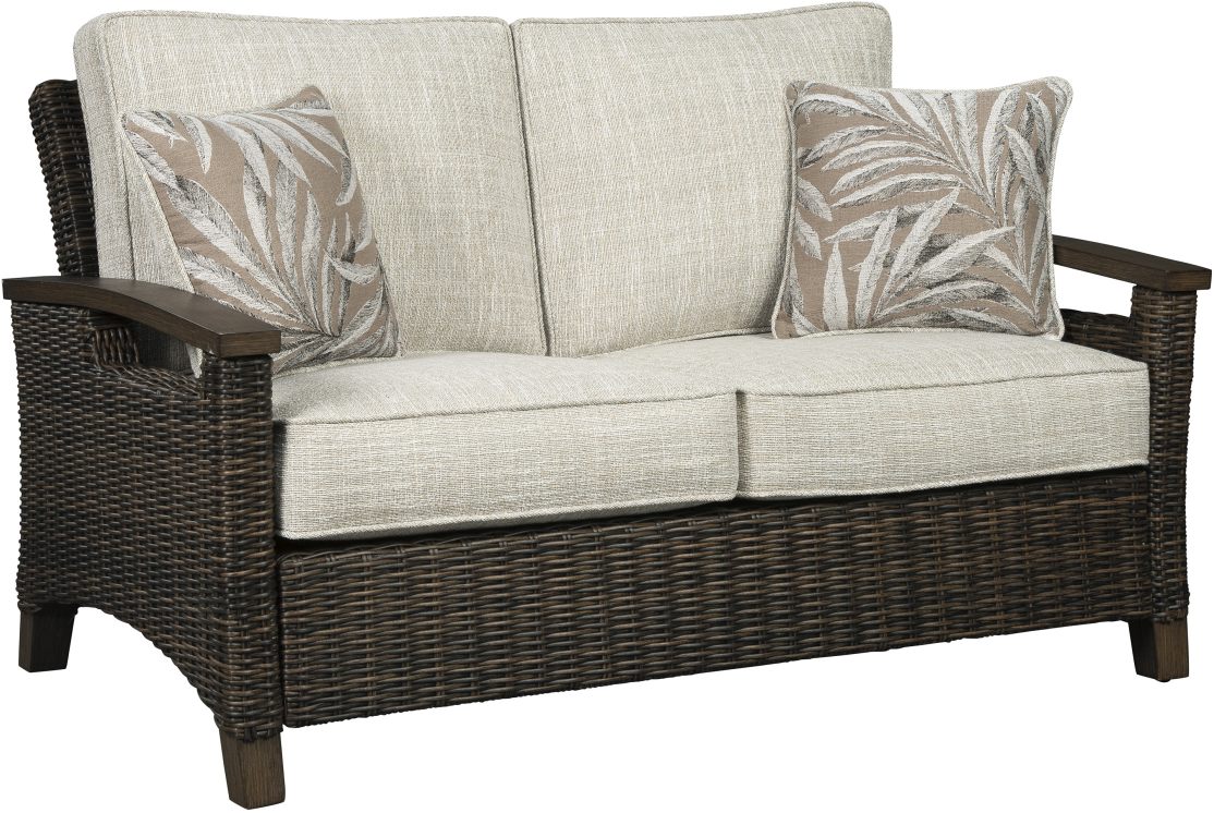 The Paradise Trail loveseat features all-weather foam back and seat inserts upholstered in Nuvella® fabric. The aluminum frame in an appealing, faux-wood finish and 2 accent throws provide extra style and comfort.