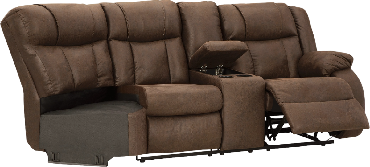 Melt into comfort at the end of your day. Accented by jumbo stitching, the walnut faux leather and sumptuous cushioning cradle your body in infinite positions of leisure. This right-arm facing reclining loveseat with console is made with faux leather upholstery.Read More