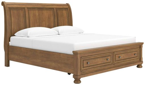 Includes sleigh headboard, storage footboard, and rails with roll slats